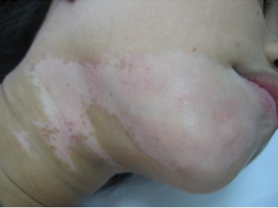 节段型白癜风的皮损面积通常较小,病情发展趋势明显,容易控制。白斑为一片或者数片,沿着某一皮神经节段支配的皮肤区域走向分布,多为单侧分布;第二,节段型白癜风大多会发生白发,部位通常为头发和眉毛。调查发现,儿童为阶段型白癜风的易发人群,占发病总数的20%左右。据病损处色素脱失情况又可将该病分为完全型与不完全型两种。前者对二羟苯丙氨酸(DOPA)反应阴性,黑素细胞消失,治疗反应差。后者对DOPA反应阳性,黑素细胞数目减少,治愈机率大。>>>节段型白癜风还有哪些危害呢,点击手机咨询专家吧!